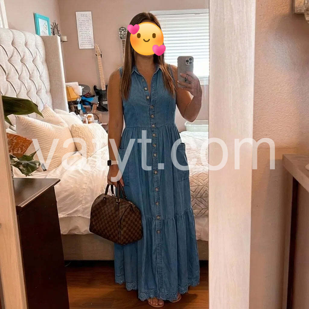 Crafted from premium denim, this sleeveless maxi dress combines timeless style with modern versatility. The flattering V-neckline and button-front closure create a refined silhouette that transitions effortlessly from casual daytime wear to evening occasions. The full-length cut offers elegant coverage while the structured denim fabric ensures durability and shape retention. Perfect for layering with jackets or cardigans, this wardrobe essential delivers both comfort and sophisticated appeal.