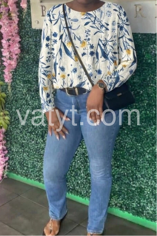 Trendy Blue Floral Round Neck Top
