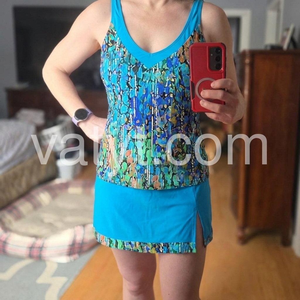 Very flattering to figure. Accentuates the waist and hides my upper thighs. If you're like me and a tad insecure about showing your booty or belly, this suit covers those areas and is super flattering on. I feel very comfortable and confident in this bathing suit.