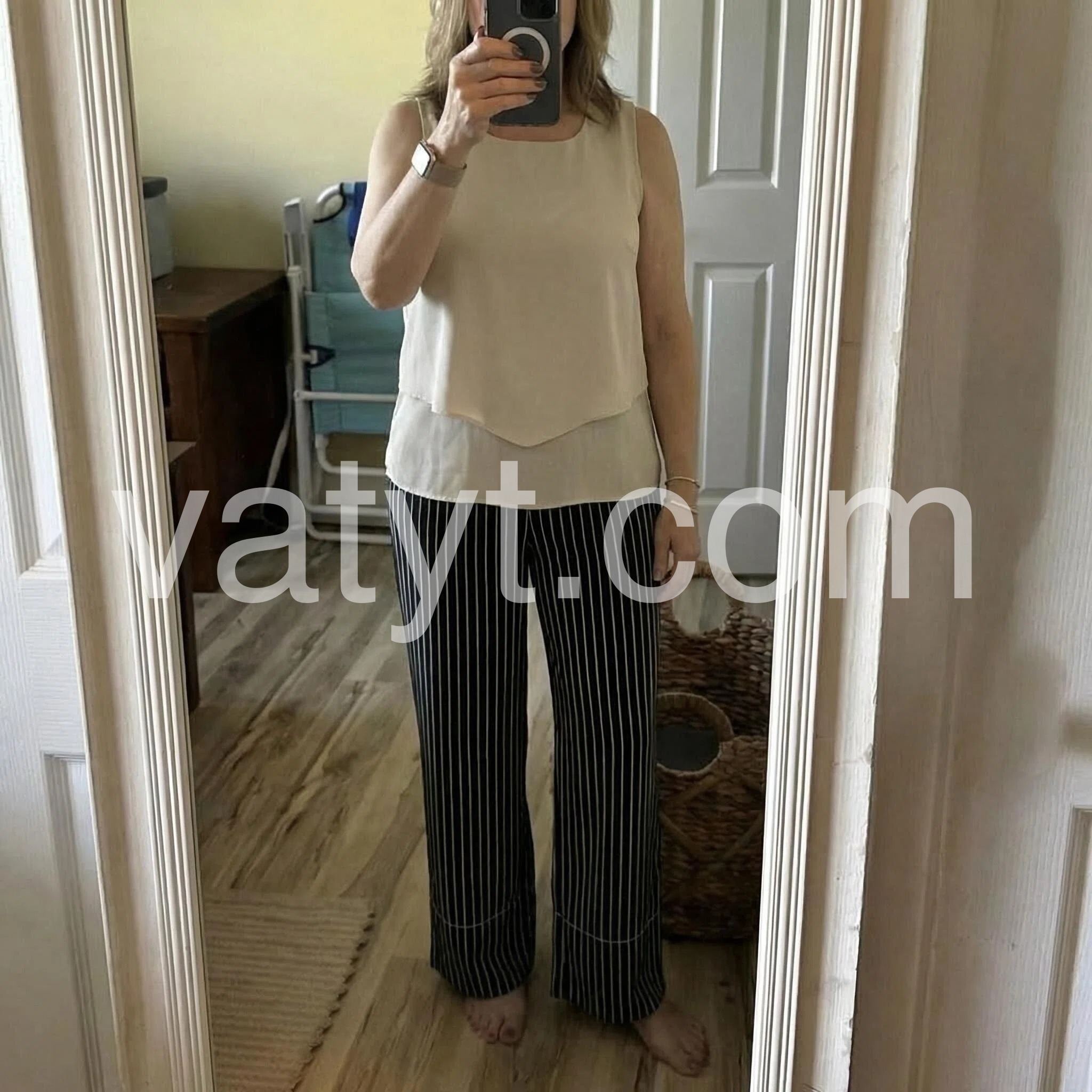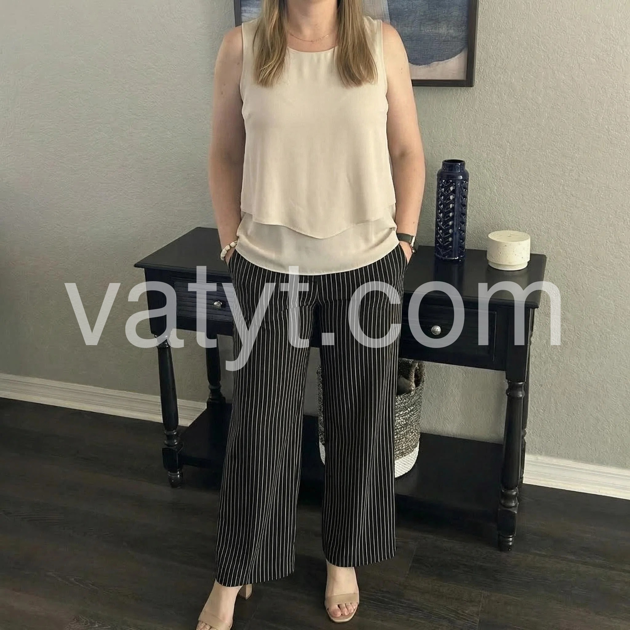 This two-piece set features a sleeveless beige top with a layered hem and square neckline. Paired with high-waisted black wide-leg pants in thin white stripes. Comfortable fit with a chic, relaxed silhouette. Perfect for casual outings or smart-casual events. Effortlessly stylish and easy to wear.
