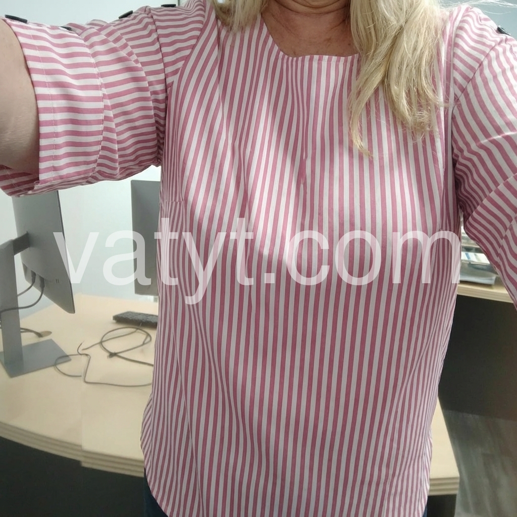 his loose-fit top features vertical pink and white stripes with stylish button details on the sleeves. Three-quarter sleeves with rolled cuffs offer a relaxed look. Round neckline for a clean, comfortable fit. Perfect for casual wear or smart-casual outfits. Bright and cheerful with a touch of elegance.