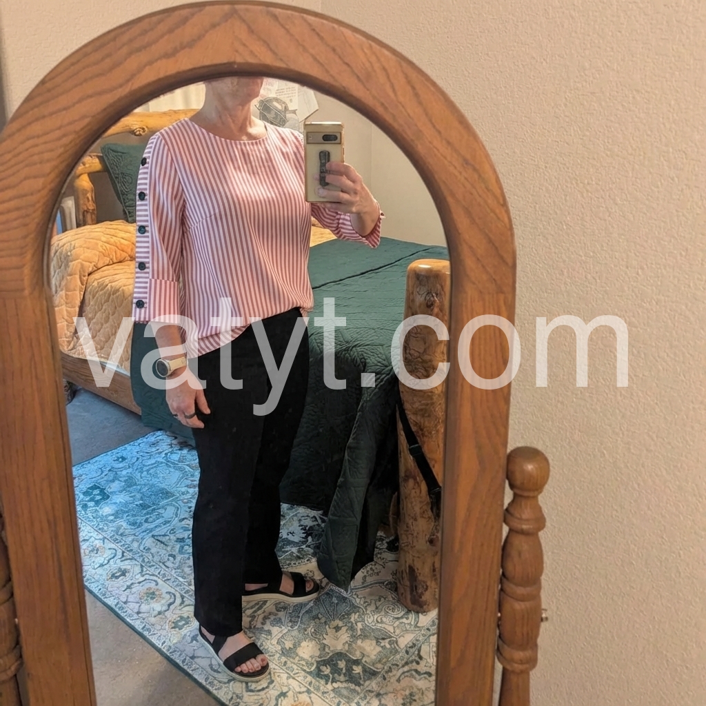 Very flattering cut! It hides my tummy perfectly without looking like a maternity shirt. The 3/4 sleeves are exactly what I wanted.