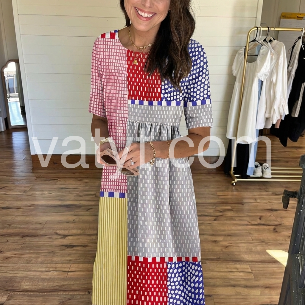 The bold, multicolored geometric patchwork print makes a striking statement, while the gathered waist and pockets add comfort and function.