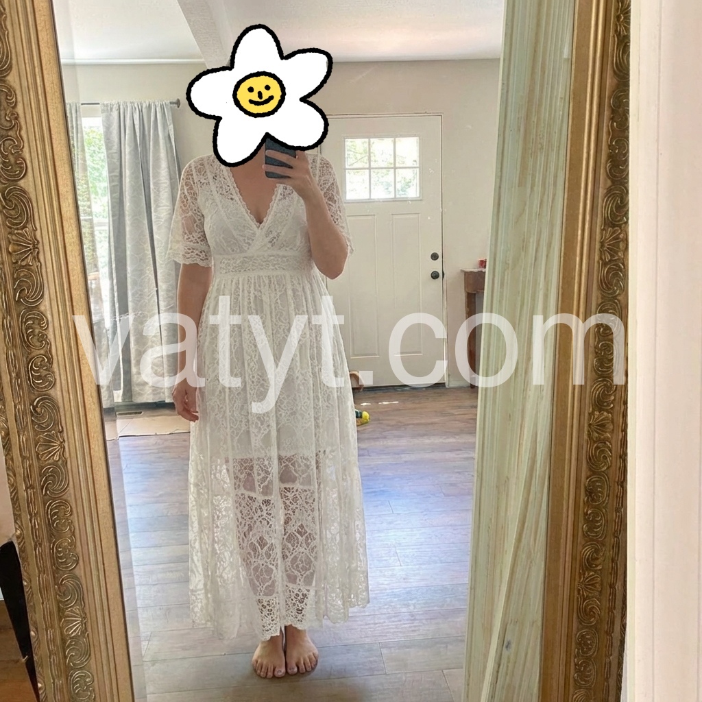 The intricate white lace, V-neckline, and cinched waist create a dreamy, feminine silhouette, with pockets for everyday ease.