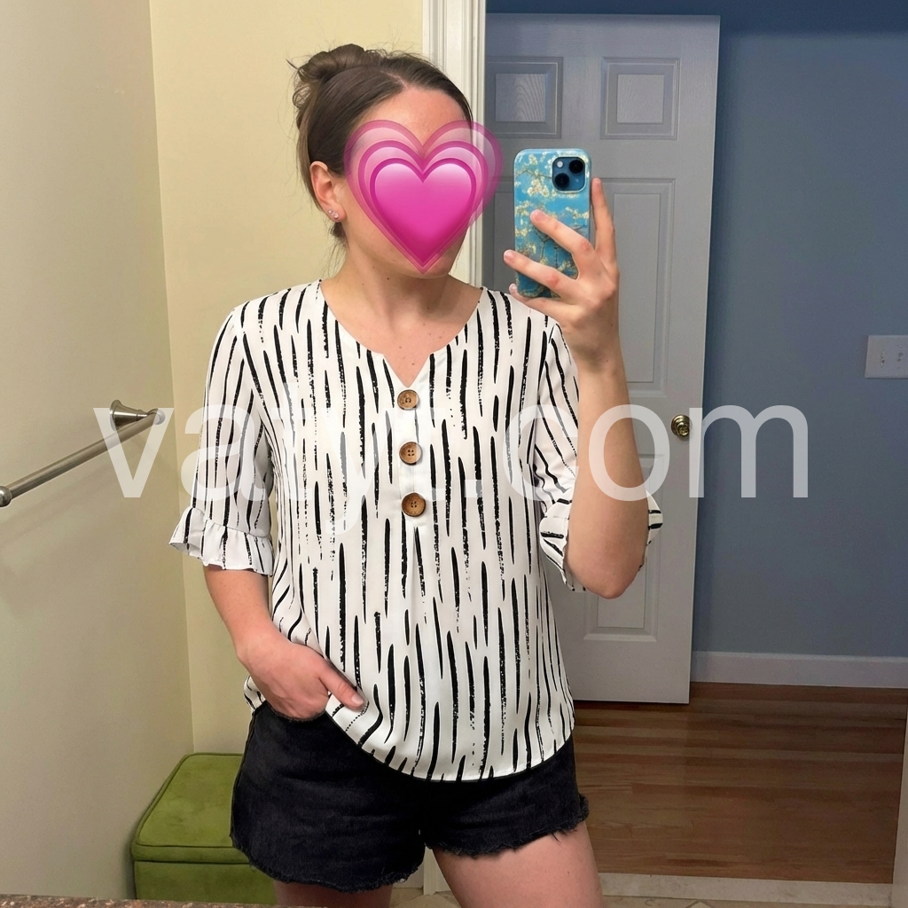 I am absolutely in love with the ruffle sleeves and those cute wooden buttons down the front! It adds such a nice boho touch. The v-neck is flattering and not too deep. Highly recommend for a casual day out.