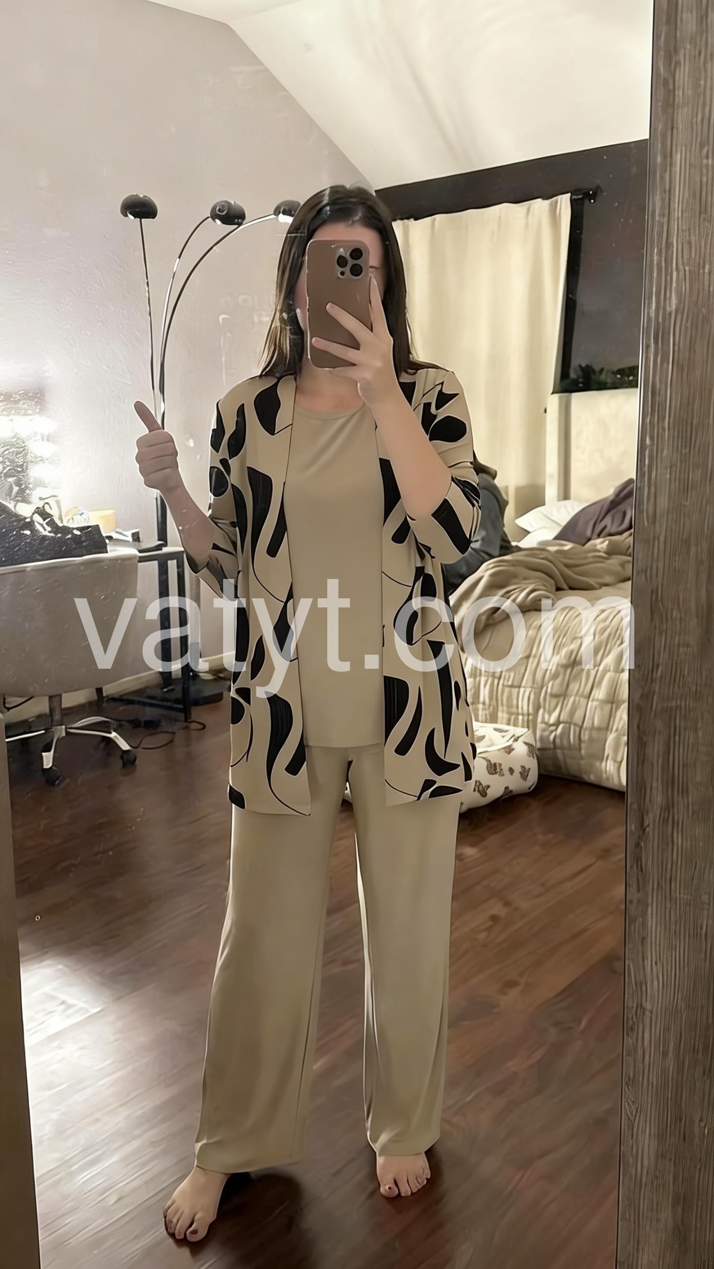 This coordinated set includes a round-neck top, relaxed wide-leg pants, and a matching open-front cardigan in soft brown tones. Made from comfortable, lightweight fabric ideal for everyday wear. The minimalist design offers effortless elegance. Perfect for casual outings or relaxed days at home. Stylish, versatile, and easy to layer.
