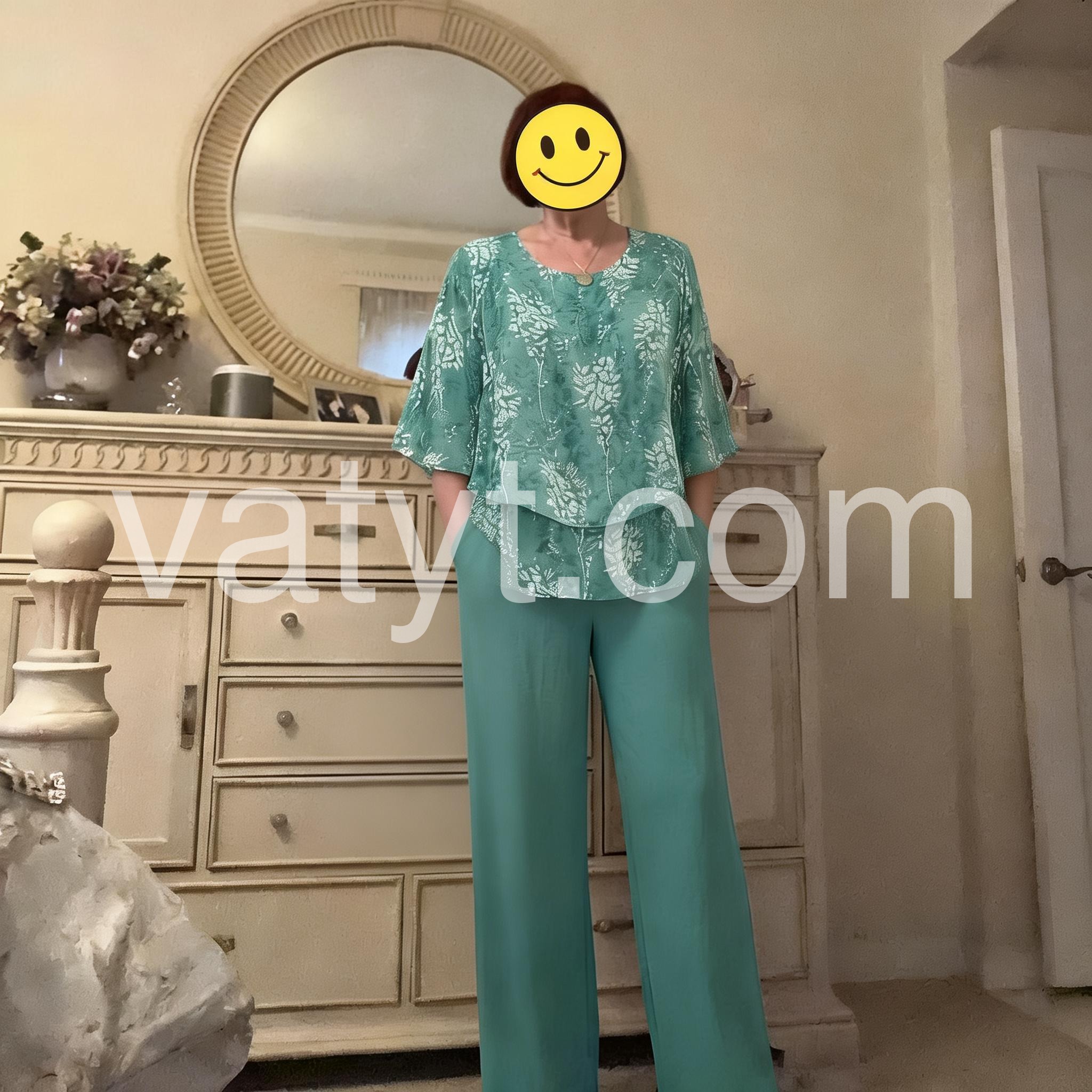 It is hard to find stylish, modest, and comfortable clothing but this set checks all the boxes. The floral pattern is delicate and the solid pants balance it perfectly. It is my new go to outfit for church and luncheons.